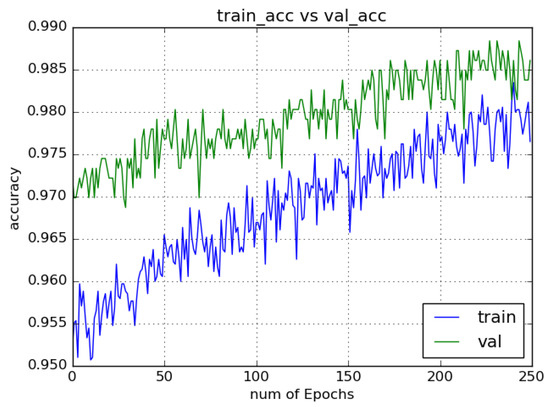 (having a shallow Convolutional Neural Networks (CNN) architecture with proper maxpooling) achieves a high validation accuracy of . The lower figure shows that both validation and training loss converged near the 250th epoch. The corresponding validation and training accuracy curve is shown in the upper figure.