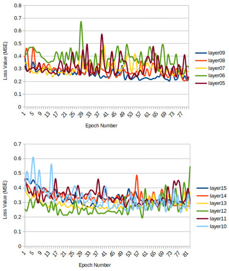 Loss values during training of models while utilizing features from different layers of the VGG-16 Network are shown. Layer 9 has the least Mean Square Error (MSE) value among Layers 5 to 9, whereas, layer 12 has the least MSE value among Layers 10 to 15.