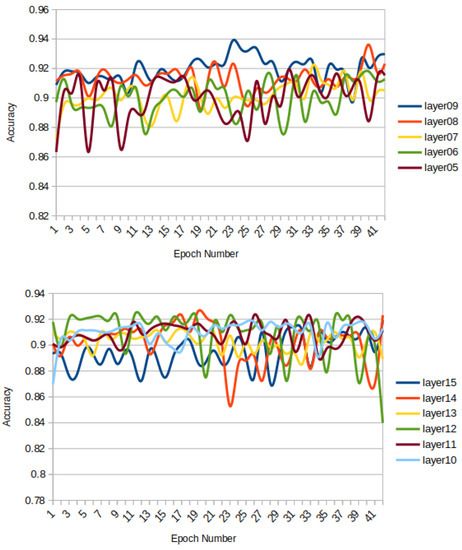 Accuracy during the training of models while utilizing features from different layers of the VGG-16 Network is shown. We have included training data from 60th epoch and upwards. Hence, the 1st epoch in the graph corresponds to the 60th epoch and so on. Empirically, transfer learning of features up to Layer 9 provides the most accurate model.