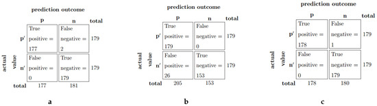 Both and have a small number of false positives and false negatives in the validation dataset. (a) Confusion matrix of in the validation dataset. (b) Confusion matrix of in the validation dataset. (c) Confusion matrix of in the validation dataset.