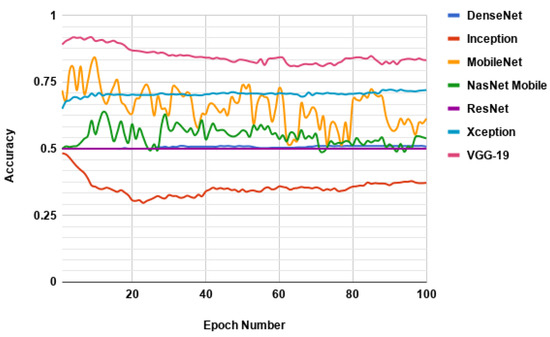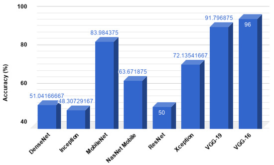 Figure 15 shows the result when the VGG-16 network is replaced with these networks. Deep networks perform far worse than those that use a fewer number of layers. For example, the VGG-19 network has almost identical performance to that of the VGG-16 network. It has 91.80% validation accuracy, which is 4:20% less than the VGG-16 network. Other networks achieve 65.43% accuracy on average. Only the accuracy of the mobilenet crosses 80% threshold in our experiments. Xception is the closest in performance with around 72.14% accuracy. All others achieve an accuracy closer to 50%. Because this is a binary classification with an equal number of training and validation samples, 50% can be the least possible accuracy and, hence, is the baseline for our experiments. Figure 16 reports the training of the models.