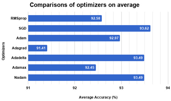 We choose Stochastic Gradient Descent (SGD) as the optimizer based on its performance on a series of experiments. We fix all the hyperparameters except optimizers. We train the models several times for each optimizer and measure the average accuracy for all of them. Figure 17 indicates that, although they are almost identical in performance, SGD is slightly better than others.