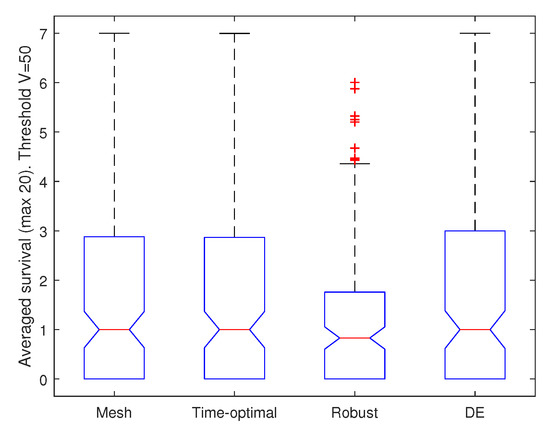 Table 7 summarizes the mean and standard deviation statistical results obtained by the compared algorithms. It can be seen that DE/rand/1/bin obtains the highest average values in all the problems that were solved. Nevertheless, the higher standard deviation values obtained by DE/rand/1/bin in problems B1D4-1 and B1D4-2 confirm those expressed by the non-parametric tests—the differences are not significant with respect to the random sampling methods. Figure 4 and Figure 5 have the box-plots for B1D4-1 and B1D4-2, where all the compared algorithms reach survival times between 1 and 3, with the exception of the Robust approach in B1D4-1, but such a difference was not significant.