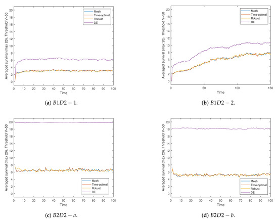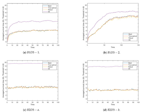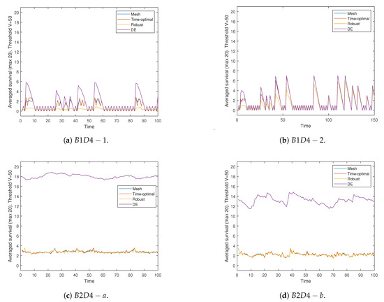 The results for the problems generated with dynamics 1–4 are detailed in Table 7 and graphically shown in Figures 6–9, for each one of the four dynamics. In all four figures, those labeled with (a) and (b) present the results obtained in the MPB1 problems, while those labeled with (c) and (d) refer to the MPB2 problems. In all cases, the average survival values obtained by Mesh, time-optimal and robust approaches are compared against DE.