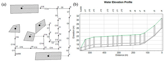 Because the validation of the HRCM model was evaluated by Cai et al. [28] and the objective of this study is to compare the performance of different frameworks, we assumed two idealized scenarios in which it is easy to recognize narrow and aged pipes. Therefore, we can easily evaluate the performance of different frameworks. The configuration of the drainage system used the system proposed by Bennies et al. [29] (Figure 4).