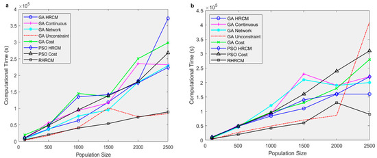 Different methods exhibited discrepancies in calculation speed under the various scenarios. The GA-Unconstraint method had the minimum calculation time in the first scenario. There is a bump up when the population equals 2500 of GA-Unconstraint in the second scenario. We calculated two simulations for the GA-Unconstraint method with the population size being equal to 2200 and 3000, respectively. The computational times were 77,286 s and 89,393 s, respectively. Therefore, we inferred that the high computational time for the GA-Unconstraint method at the population size (equal to 2500) is because of the fluctuations of the program. The GA-Continuous method had a fast convergence speed for both scenarios. It was found that the GA-HRCM method was the slowest method (Figure 5). The computational time comparison between the RHRCM method and the other seven modified methods is presented in Figure 5. The RHRCM method exhibited the fastest speed compared to the other seven methods, and it was stable with respect to the population increase in scenario 1. This property can be also seen from the computational time comparison of scenario 2. The RHRCM method was relatively stable, compared to the GA-Unconstraint method. It showed a significant advantage over other methods in terms of computational speed.