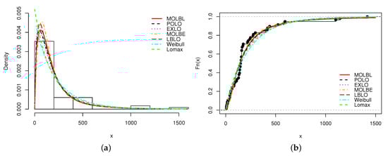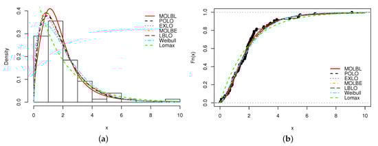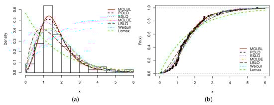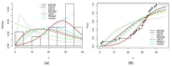 In all the figures, we see that the MOLBL model better adjusted the empirical objects, making enough pliancy to adapt to the right or left skewness property of the data, as well as versatile peakness.
