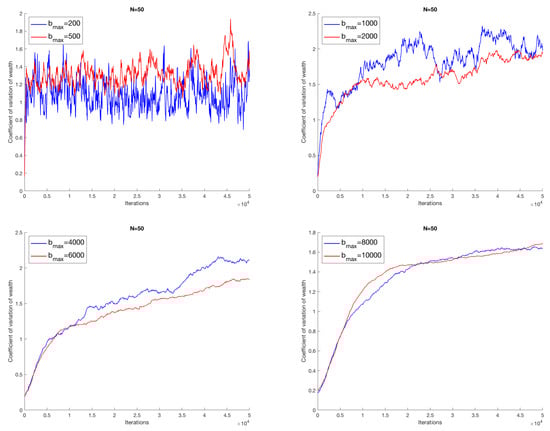 The plots in Figure 1 show the evolution of the coefficient of variation with increasing iterations of the different simulations carried out respectively for , 500, 1000, 2000, 4000, 6000, 8000, 10,000, when the number of economic agents is 50.