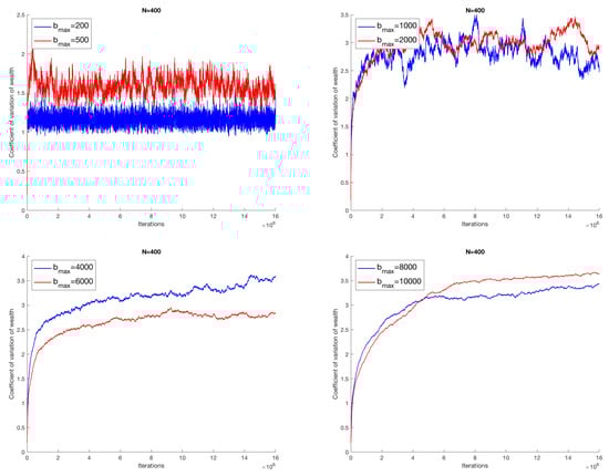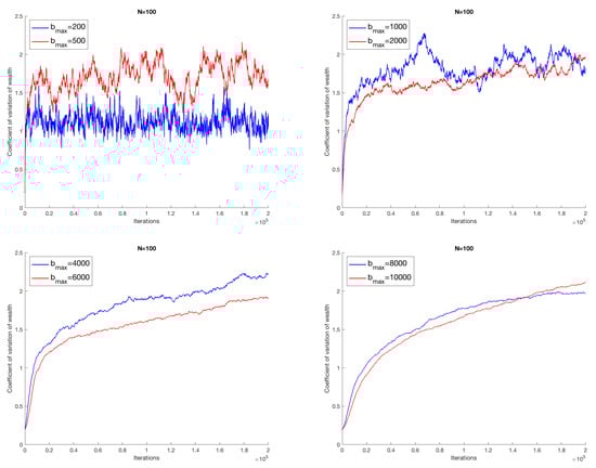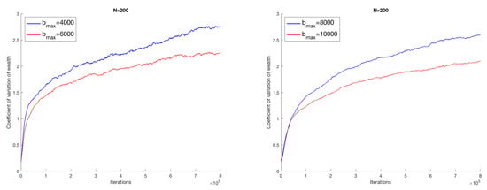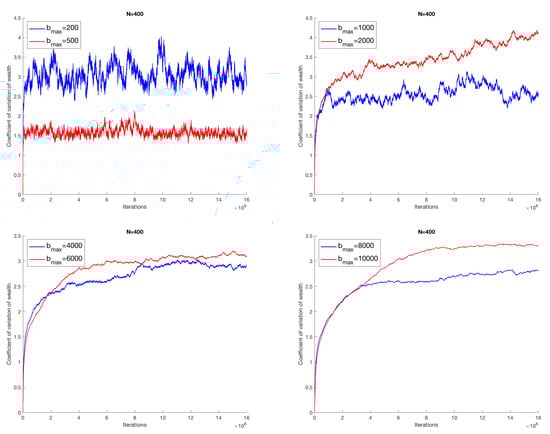 To prove that the critical parameter affecting the numerical output of the model is , in Figure 5, we report the trends of the coefficient of variation of the amount of money of the economic agents as transactions go on for , in the case where initially all economic agents have the same amount of money, and of monetary value of the goods/services (both equal to ). In such a way, all agents enter the market with the same conditions, and inequality arises only as a consequence of the random fluctuations induced by transactions.