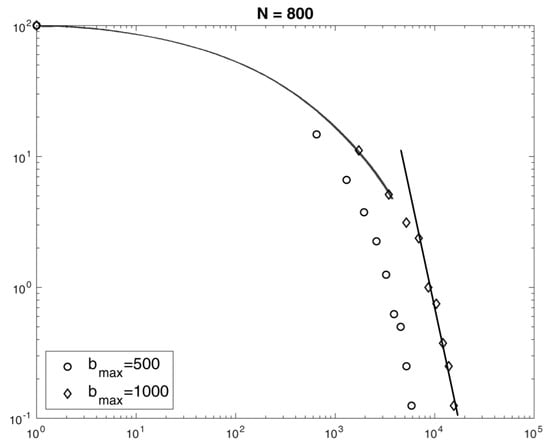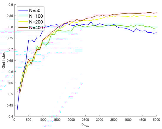 The existence of two distinct macroscopic phases is consistent with the aforementioned independently developed studies [20,21,22]. These latter simulations, although carried out in a microscopic model much different from the one proposed here, and therefore analyzed with the variation of other parameters, are based on simple random interactions and show two distinct evolutionary stages of the economic systems. The analysis in the supercritical phase confirms the non-ergodicity of the model. When the initial conditions, determined randomly, can take on highly unequal features, the system retains memory during future iterations and traps itself progressively without being able to explore the entire space of possible solutions. Figure 6 shows the Gini index at the end of the sequence of transactions for different values of N as a function of . The trend confirms the conclusions previously described.