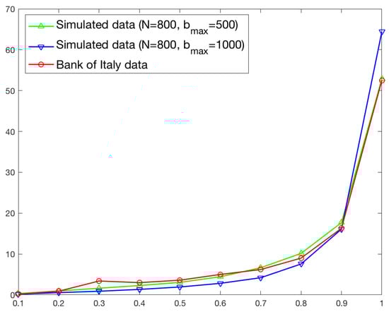 A more detailed analysis of the distribution of wealth shows results of great interest when compared with empirical quantitative studies developed in [25] on probability distributions of wealth and incomes in the United Kingdom and the United States. The plot in Figure 7 shows the cumulative percentage of the population (i.e., economic agents) as a function of the level of wealth, as they emerge from the different simulations carried out when with , which are, respectively, the lower and upper bounds of the threshold region.