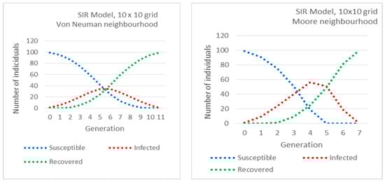 This discrete grid model has been deeply analyzed and compared with the continuous models solved by ordinary differential equations (ODE), with the intention of finding the homologous parameters between both approaches [,,,,,,]. Three parameters are crucial for the characterization of our proposal: neighborhoods, delays and update rules. Neighborhoods allow different speeds of propagation. They also determine the height and timing of the peak of the outbreak. The neighborhoods play the role of parameters β infection rate), and γ (recovery rate) in ODE.