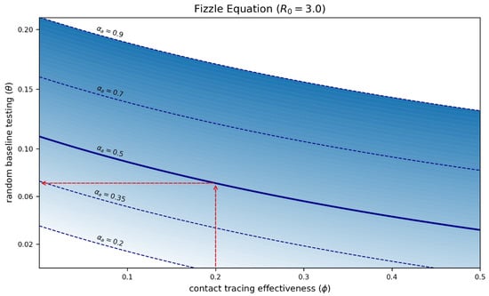 Solution of the Fizzle Equation for values in Table 2. The random baseline testing ( is the daily test rate contact tracing effectiveness for a range of asymptomatic rates for a basic reproductive number of 3.0. For a given contact tracing effectiveness and asymptomatic rate, testing at or above the indicated baseline test rate will ensure an effective reproductive number of less than unity and that any nascent outbreak fizzles rather than grows exponentially. For this instance, when the reproductive number is 3.0, with a 20% efficiency at contact tracing effectiveness, and 50% of the population is asymptomatic, the daily baseline testing rate is 7%, as shown by the red arrows.