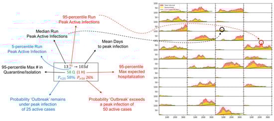 This model also helps leaders allocate limited infrastructure for quarantine and isolation, by providing predictions on the number of exposed and known infected individuals within a given confidence interval. Decision makers may anticipate and reserve adequate space to quarantine and isolate infectious individuals to stem the virus spread. This information, in addition to the amount of time before the peak infection, may be seen in Figure 2, which annotates the values and information typically gleaned from a simulation run. To demonstrate the effectiveness of testing at the fizzle condition, Figure 3 compares transmission dynamics of SARS-CoV-2 through a 5000-person population with surveillance testing at and below the fizzle condition.