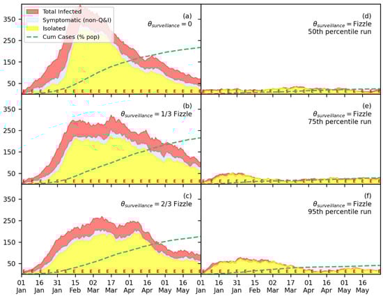 Demonstration of surveillance testing at and below the Fizzle condition. , 50% asymptomatic rate, 20% contact tracing effectiveness, and 85% test effectiveness for the infected compartment. Results are the median run (ordered by peak infection) of 100 simulations of the stochastic SEIR model except as noted. Cumulative cases are depicted as percentage of the entire population (top of y-axis is 100%). Population size is 5000; initial conditions include 25 exposed on 1 Jan (0.5% of population) and 2 new random exposed cases introduced every week (depicted by red E). (a) No surveillance testing (symptomatic individuals are identified through volunteering of symptoms and are contact traced with the same contact tracing effectiveness); (b) daily surveillance testing at 1/3 the predicted fizzle rate; (c) daily surveillance testing at 2/3 the predicted fizzle rate; (d) testing at the fizzle rate (median run); (e) testing at the fizzle rate (75th-percentile run); (f) testing at the fizzle rate (95th-percentile run).