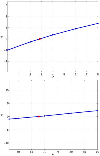 Figure 4. Two cases of the Γ ( h * ) function: top and bottom frames are related to normal and reverse flow solutions, respectively.