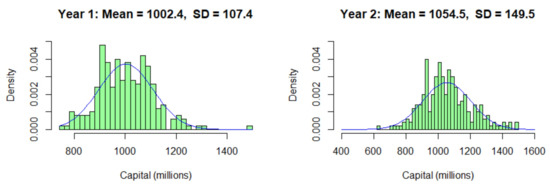 The predictors and can then be used to generate a random sample of lognormally distributed losses for quarter . The sample size is set to the number of days, , in that quarter. Capital can then be calculated for the combination of the losses generated for quarter (which can be stressed), with historic losses from the preceding quarters. The window then advances by one quarter at a time.