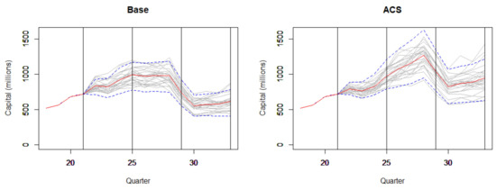 The basis of “Forward” Stress testing is set out explicitly by Drehmann [16]. The process comprises four stages: scenario generation, developing risk factors, calculating exposures, and measuring the resulting risk. Stages 2 and 3 of that sequence may be summarised by Equation (1), in which represents an algorithm that calculates , the capital at time t. The arguments of are two vectors, both at time t: losses and stress factors . The precise way in which they are used remains to be defined precisely.