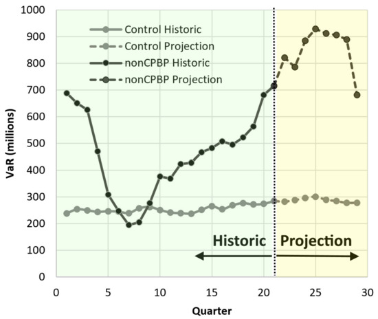 The last window that can be formed from the historic data spans the period to . The corresponding time series and are then used to predict the next pair of lognormal parameters and . The prediction is made using Loess fits to the and time series plus a “mean reversion” term to counter the trend continuation tendency of Loess. Therefore, if represents the Loess function with span parameter s applied to a time series argument X and is the expected value of the argument X, then we can define a linear combination operator that acts on X. We found that produced credible results. With that operator, the and predictors for quarter are given in Equation (5).