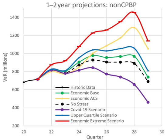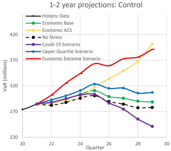 The important aspect of “prediction” in the context of stress testing is to compare unstressed losses with losses that have been stressed by appropriate scenarios (such as worsening economic conditions, increasing cyber crime, decreasing reputation, etc.). Therefore, although predictions under stressed scenarios can be viewed in isolation, the change in predictions relative to corresponding unstressed predictions is important. Therefore, we provide “no stress” predictions to compare with the stressed cases.