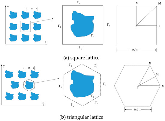 For the perfectly phononic crystal with infinite periodic structure, as shown in Figure 1, we can only consider the unit cell instead of the whole structure. –(–) denote the boundaries of the square (hexagonal) unit cell and represents the interface between the matrix and the scatterer. All the quantities of the anti-plane transverse elastic wave field on periodic boundaries –(–) should satisfy the Bloch theorem, namely,