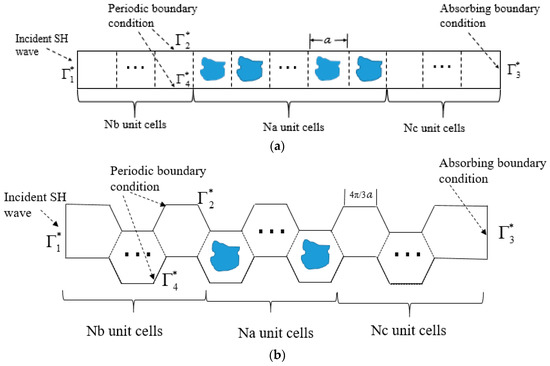 For a perfectly phononic crystal with semi-infinite periodic structure in the y-direction, the periodic unit cell, as shown in Figure 2, can be considered, where Figure 2a,b represents two types of the SH wave propagation along and directions. Then, the displacements and tractions on the boundaries satisfy the following relationships: