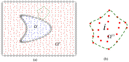 The schematic diagram for (a) the computational domain, boundary, and distribution of nodes; (b) The subdomain of the i th node.