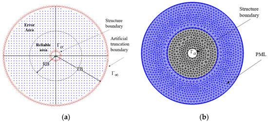 In the proposed LCTM implementation, the computational domain, as shown in Figure 4, needs to be truncated into finite domain with absorbing boundary , and the weakened Sommerfeld boundary condition is used as the following absorbing boundary conditions (ABC) [59]: