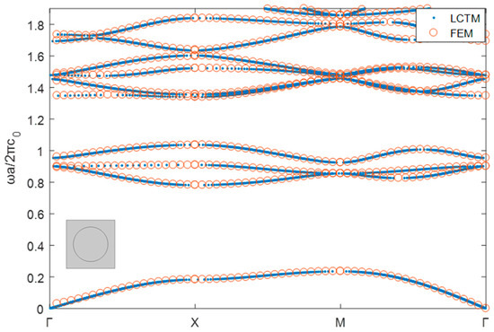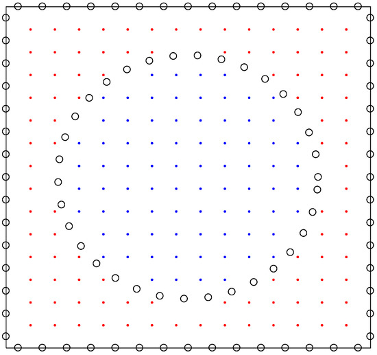 In the first example, the unit cell structure of aurum/epoxy phononic crystal consists of a square lattice and a circular scatterer. The filling fraction of the circular scatterer is 0.4. Figure 5 shows the corresponding node distribution in the proposed LCTM. In the present numerical implementation, the discretization node number is with node spacing . The calculated band structures obtained by using the proposed LCTM and the FEM (COMSOL, 288 elements) are in good agreement, which is shown in Figure 6.