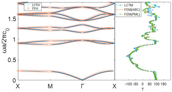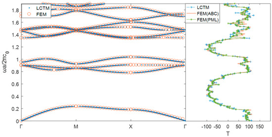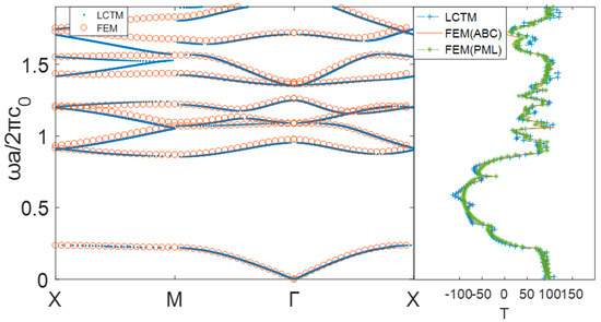 Transmission spectra aurum/epoxy phononic crystal with circular scatterer, along with the direction and the band structures calculated by the proposed LCTM and FEM (ABC), FEM (PML).