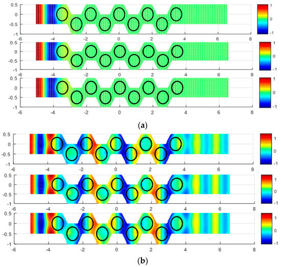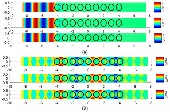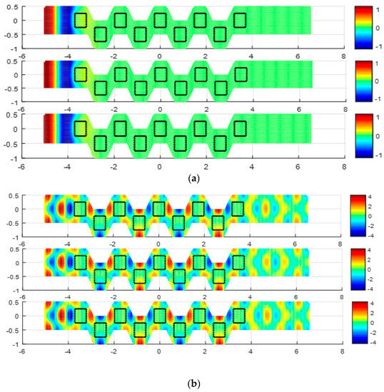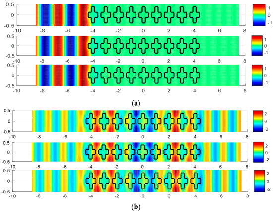 As shown in Figure 14, it can be found that when the angular frequency is within the range of band gaps, the transmission coefficient is very low, namely, the low transmission coefficient region corresponds well to the calculated band gaps. Figure 15 shows the displacement amplitude distributions computed by the proposed LCTM and FEM + ABC/PML (COMSOL) presented at two specific normalized frequencies (). It is easy to observe from Figure 15 that the SH wave is blocked at the normalized frequency () in the bandgap region, and it cannot hinder the SH wave propagation at the normalized frequency () in the pass band region.