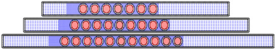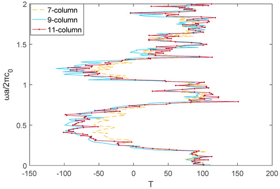 To investigate the effect of the number of columns (scatterers) on the wave shielding, 7-column, 9-column and 11-column finite periodic structures are considered, as shown in Figure 10. Figure 11 shows the result of the transmission spectra of 7-column, 9-column, and 11-column finite periodic structures. As shown in Figure 11, with an increasing column number, the transmission coefficient tends to the one with infinite periodic structures. Since the transmission coefficients are almost the same between 9-column and 11-column finite periodic structures, nine-column finite periodic structures are employed in the following numerical investigations.