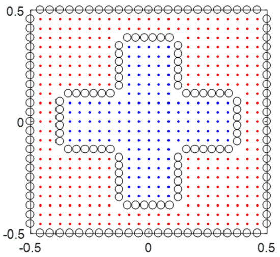 Here, the unit cell structure of aurum/epoxy phononic crystal consists of a square lattice and a cross-shaped scatterer and the measurements of the cross are 0.75 by 0.25. The filling fraction of the cross-shaped scatterer is 0.3125. Figure 12 and Figure 13 show the corresponding node distributions in the proposed LCTM. In the present numerical implementation, the discretization node number is with node spacing for band structure calculation, and the discretization node number is with the same node spacing for the calculation of transmission spectra and displacement amplitude distributions. The calculated band structures and transmission spectra obtained by using the proposed LCTM and the FEM (COMSOL, 264 elements for band structures, 6284 elements for transmission spectra) are in good agreement, which is shown in Figure 14.