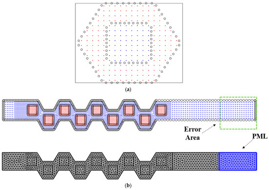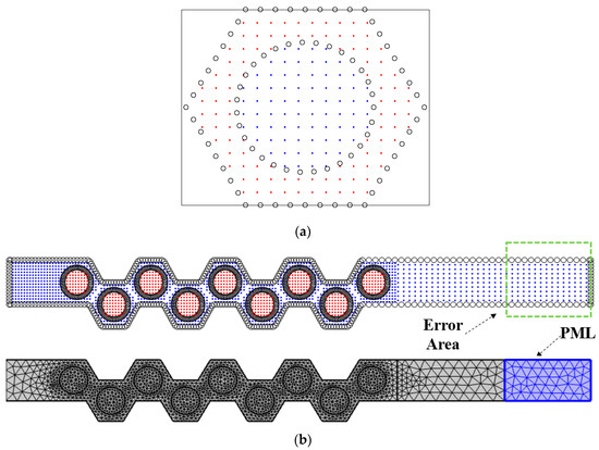 Nodes distribution for (a) the unit cell of phononic crystal with a hexagon matrix including a circular scatterer; (b) Node distribution with error region and element distribution with PML region for the phononic crystal with semi-infinite periodic structure in the y-direction.