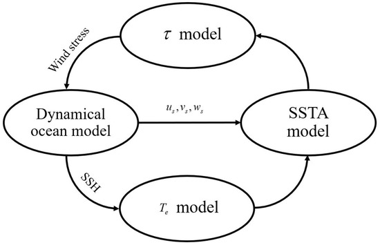 The advantage of EICM over an OGCMs is that their simplicity allows them to be used for mechanism analysis. This is well recognized, and other efforts have been made to improve the simulation of zonal currents and SST in EICMs [27,28]. The improvements in these models have only been achieved by the addition of high order baroclinic modes. These models are less realistic than the model with data assimilation. The equation for sea surface temperature anomaly (SSTA) that is implemented in the SST (sea surface temperature) component is calculated by Equation (1),