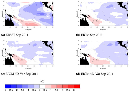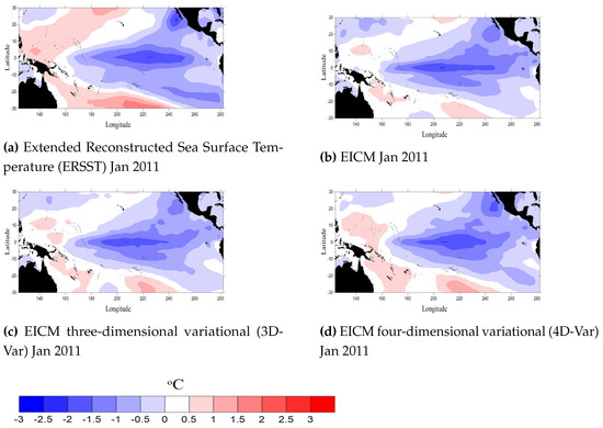 The model’s results were compared with the observed data in 2011. The prediction of the SST values of the model with and without data assimilation are called EICMDA and EICM, respectively. The results of the two simulations were compared with observable data in order to determine whether the data assimilation algorithm was working properly. A preview of the SSTA results from each simulation was compared with the observations made in these months to assess the accuracy of the preliminary model. Figure 3, Figure 4, Figure 5 and Figure 6 shows SSTA forecasts for Niño [33,34,35] and the Pacific Ocean (31 S to 31 N, 124 W to 282 W) from EICM and EICMDA in January, March, June, and September 2011 using data starting from December 2010, February 2011, May 2011, and August 2011, respectively. During the severe La Niña incident in January, all three simulations gave SSTAs that were less than the 30-year average. The forecast results of EICMDA with 4D-Var (Figure 3d) gave SSTA values of less than EICM (Figure 3b) and EICMDA with 3D-Var (Figure 3c), which are more closely matched to the measurements from ERSST (Figure 3a) at the Niño region. In the western Pacific region, EICMDA with 4D-Var gives higher SSTA than the 3D-Var method and EICM, respectively.