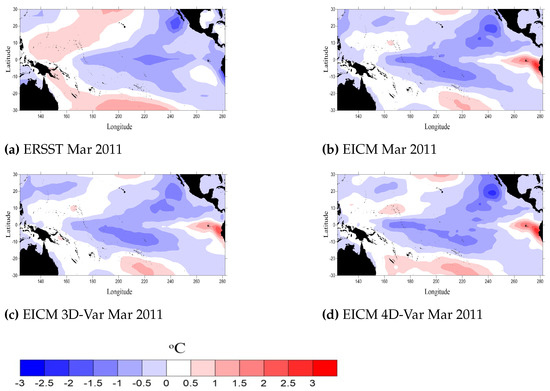 In March, when the weak La Niña phenomenon occurred, all three simulations showed an increase in SSTA values over the 30-year average in the Niño region, which was different from the measurement data (Figure 4a) that SSTA will increase, but still less than the 30-year average. In the west of the Pacific, the 4D-Var method (Figure 4d) also had an increased SSTA than 3D-Var method (Figure 4c) and EICM (Figure 4b).
