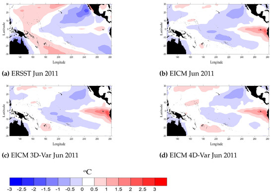 During the period of neutral state (June), it was found that the three simulations gave no significant difference in their forecasting values. However, it was found that the SSTA of the 4D-Var method was closer to the measurement data than 3D-Var and EICM at Niño region, respectively (Figure 5a–d).