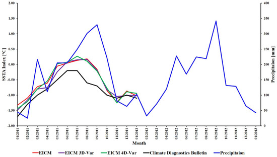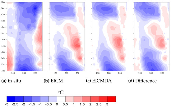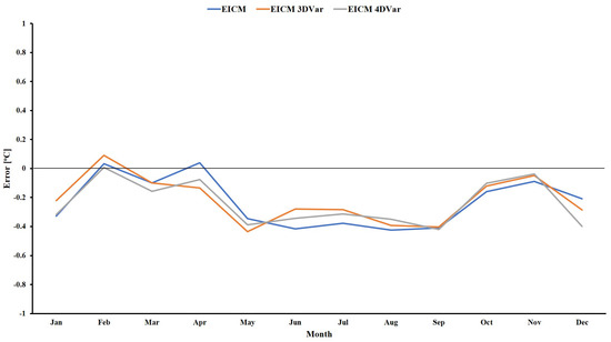 An error describes the difference between a simulation value and observation value. A comparison of the monthly error showed that, when the ENSO phenomenon occurred in the period of January to April and October to December, as shown in Figure 12, all three simulations were able to calculate the anomalies of temperature close to the source data, with the tolerance approaching 0. In the range not exceeding the ENSO phenomenon, the EICMDA gives a tolerance of 0.3, which is less than the EICM, which gives a tolerance of 0.4, as shown in Figure 10. During April to May, the tolerances of the EICM without data assimilation were significantly larger than the EICMDA. It can be seen that the model with data assimilation gives a lower tolerance.