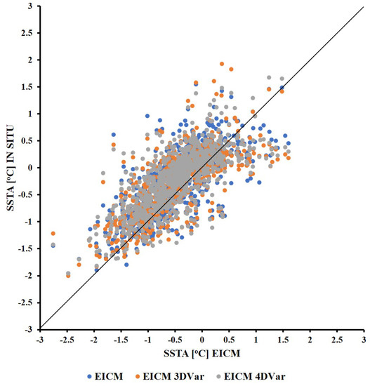 The understanding of the relationship between variables is a very important aspect of statistical analysis. Scatter plots are used to observe correlations between the result of the model. In this work, the SSTA was modeled in three simulations: the EICM and EICMDA simulations with 3D-Var and 4D-Var methods. A scatter plot uses points to explain the SSTA values from each simulation, as shown in Figure 9. The location of each point on the vertical and horizontal axis indicates SSTA values for an individual data point. Figure 9 compared the performance of the three assimilation algorithms with the in-situ data, and found that the values of each SSTA were not very different. The EICM 4D-Var has less SSTA variance than the other methods, which can be seen in less SSTA distribution than the other methods. EICM without Data Assimilation had greater SSTA variability and, for the three simulations, the majority of SSTAs were less than the in-situ. The distribution of points in the scatter diagram represents the greater relationship between the data.