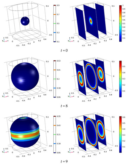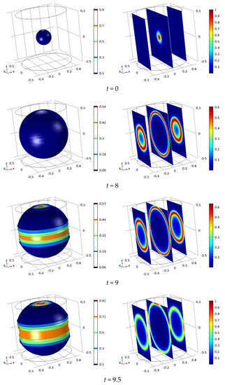 In order to obtain a benchmark for cancer cell progression in the absence of an applied electric field, we put E = 0 in Equations (4) and (7). In Figure 1, the 3D iso-surface cancer cell distribution is shown in the first column, while, in the second column, the cancer cell distribution is cut along three slices lying in the yz-planes, and then normal to the x-axis, for x = −0.38, 0, and 0.38. In all figures the cancer cell concentration is mapped in color scale. At t = 0, due to the imposed initial conditions, a cluster of cancer cells is isotropically distributed around the domain origin, as expected. At t = 8 (≈ 0.9 days), the surface delimiting the cancer/healthy cells is smooth; such behavior is unchanged up to t = 9 (≈ 1 day), when the cells growth reaches the boundary surfaces of the simulated domain, as evidenced by the central slice of the second column, while for t = 9.5 (≈ 1.1 days), because of the imposed boundary conditions, cancer cells begin to spread on the boundary surfaces.