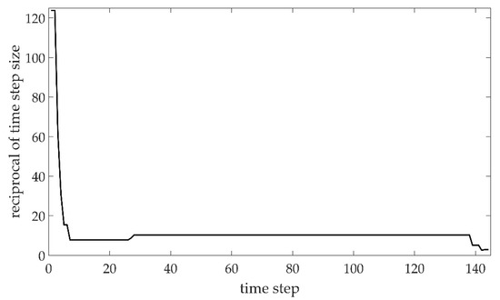 Reciprocal of the time step size versus the time step. Increasing time step sizes indicate good mesh convergence.