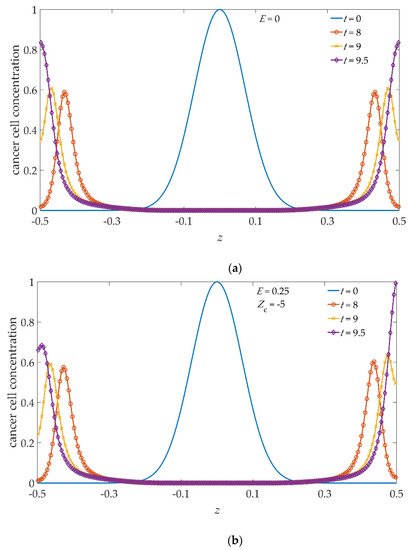 Profiles of the cancer cell concentration along the vertical cutline (see text). (a) In the absence of an applied electric field; (b) Applying a uniform electric field in the negative z-axis direction, with intensity E = 0.25, putting Zc = −5. Snapshots are taken at t = 0 (blue), t = 8 (red/circle), t = 9 (yellow/cross), and t = 9.5 (purple/diamond).