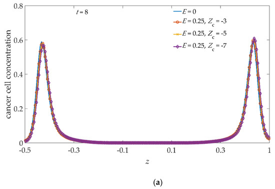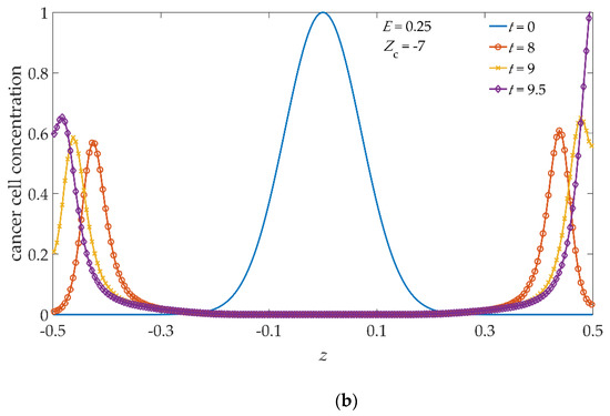 Profiles of the cancer cell concentration along the vertical cutline, applying a uniform electric field in the negative z-axis direction, with intensity E = 0.25. (a) Zc = −3; (b) Zc = −7. Snapshots are taken at t = 0 (blue), t = 8 (red/circle), t = 9 (yellow/cross), and t = 9.5 (purple/diamond).