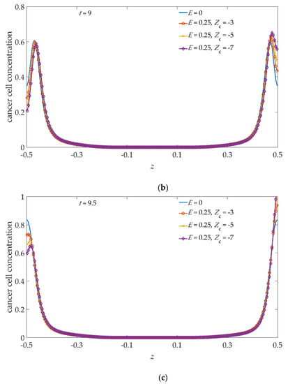 As the malignant activity of cancer cells is related to their negative net charge, as a result of abnormal glucose metabolism [23,24], we hypothesize that the cancer cell charge number can assume values slightly below, or slightly above, with respect to the ansatz Zc = −5 representing a kind of ”mean” malignant activity, in other words, we assign, to cancer cells, a charge number Zc = −3, or Zc = −7, depending on whether the malignant activity is lower or higher than the average. In this respect, we have computed the dynamical evolution of our system subjected to the same electric field imposing two more charge numbers for cancer cells, i.e., Zc = −3 and Zc = −7. The behavior of the 3D iso-surface cancer cell distribution, and of their 2D slices, are similar, from a qualitative point of view, to the images shown in Figure 3, therefore, we do not show them; instead, we show the cancer cell concentration profiles along the previously defined vertical cutline, in Figure 5a,b, for Zc = −3 and Zc = −7, respectively. As it can be seen, during the time evolution, the asymmetries already observed in Figure 4b are still present, weaker in Figure 5a, and more pronounced in Figure 5b. By increasing the charge number for cancer cells, the tumor invasion front moves rigidly towards the upper confining surface along the electric field direction, and the intensity of the asymmetries also grows accordingly. In particular, comparing the profiles of Figure 4b and Figure 5b, it can be seen that with Zc = −7 the invasion front reaches the upper xy boundary surface a little earlier with respect to Zc = −5. Evidently, the simulation with Zc = −5, shown in Figure 4b, represents the intermediate case between Zc = −3 and Zc = −7.