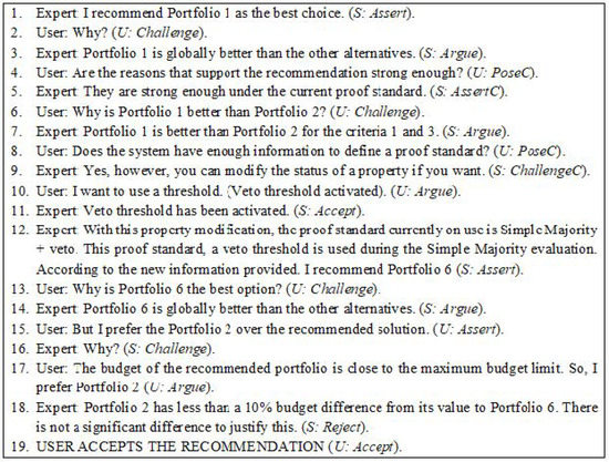 The work presented in Cruz-Reyes et al. [36] proposes a framework design for generating DSSs focused on a PPS problem by characterizing arguments and dialogue using argumentation theory and rough sets theory. The framework has a justification module for the recommended solution shown to the user; the justification is supported by argument schemes and decision rules generated with rough sets. The process starts by obtaining available preferential information provided by the DM and selecting the appropriate multi-criteria method to evaluate the available portfolios. After, it generates a recommendation and its justification interactively. This work focuses more on the decision rules generated through rough sets. The argumentation theory is a complementing element of the architectural design, and it is presented only in a conceptual form.