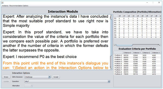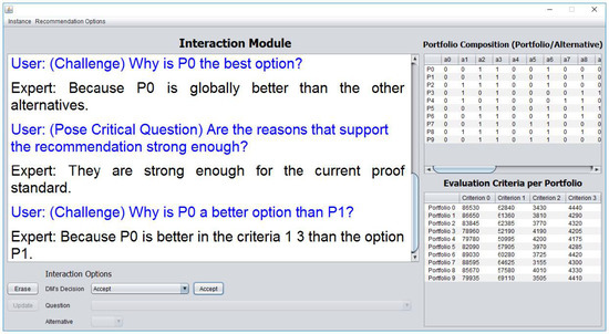 These last three proposals allow the user to provide new preferences by using queries. The proposal presented in this paper aims to provide an interactive recommender system that receives new preferential information from the DM and adapts its recommendation. The proposed system is also able to provide the DM with new information based on the knowledge obtained. In addition, the system can argue and defend its proposed project portfolio selection through arguments, with the objective that the DM understands, through dialogue, that the recommendation presented by the system is the most appropriate based on the current information.