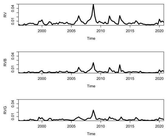 where denotes the daily return (computed as the log-difference in consecutive daily prices), and denotes the number of trading days per quarter. In one of our robustness analyses, we shall also use as our dependent variable. In empirical applications, researchers often use the term “volatility” to refer to the square root of . Finally, we also consider upward (“good”, ) and downward (“bad”, ) realized variance as dependent variables in our forecasting models. Like Barndorff-Nielsen et al. [29], we compute bad and good realized variance as follows ( indicator function):