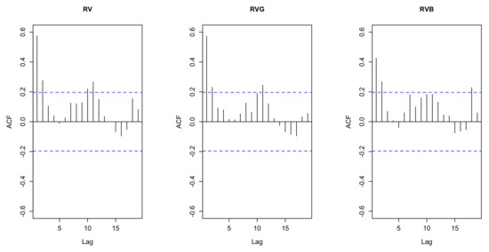 As far as the gold price is concerned, we use daily data of the U.S. dollar-based (per troy ounce) gold-fixing price (at 3:00 P.M. London time) in the London Bullion Market. The data is downloadable from the FRED database of the Federal Reserve Bank of St. Louis at: https://fred.stlouisfed.org/series/GOLDPMGBD228NLBM (accessed on 2 July 2021). After transforming the data to daily log-returns, we compute quarterly overall, upside (“good”), and downside (“bad”) realized variances by summing up the daily squared returns, positive returns only, and negative returns only over a specific quarter, and Figure 1 plots the realized variance along with its “good” and “bad” counterparts. The peak in the realized variance in the final quarter of the year 2008 witnesses the impact of the Global Financial Crisis on gold-price dynamics. Figure 2 plots the corresponding autocorrelation functions. The autocorrelation functions show that using a first-order autocorrelated process as our benchmark model should suffice to capture the persistence of realized variance.
