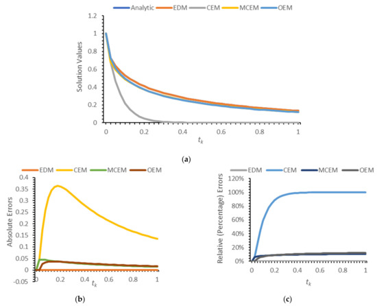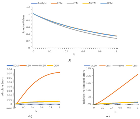 Analytic solution profile of (17) compared on to approximations by the EDM, CEM, MCEM, and OEM at with : (a) solution values (), (b) absolute errors () and (c) relative (percentage) errors ().